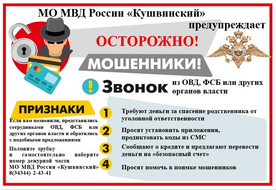 Не смотря на то что все большее распространение получают дистанционные формы мошенничества, нередки случаи, когда мошенники приходят на дом к гражданам. На территории обслуживания МО МВД России «Кушвинский» зафиксирован случай обмана лжесотрудниками социальной службы. К пожилой жительнице города Кушва домой пришли две женщины, представившиеся социальными работниками. Пока одна из женщин отвлекала потерпевшую, вторая совершила кражу денежных средств. Хотелось бы обратить внимание граждан, сотрудники социальных служб не ходят к своим подопечным по двое. Если к вам пришли незнакомые люди домой и представляются сотрудниками любых служб, прежде чем открывать дверь, позвоните по рабочему номеру этой службы и уточните, направлялись ли к вам их сотрудники и кто.