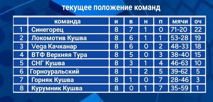 25 января в зале спортивного комплекса «Горняк» состоялись 7 и 8 туры чемпионата по мини-футболу Кушвинского муниципального округа, посвященные памяти Владимира Иосифовича Филимонова. Специальным гостем турнира стал друг и коллега Владимира Иосифовича, Юрий Партилов, который поделился теплыми воспоминаниями о нем. В рамках прошедших туров команда «Синегорец продемонстрировала впечатляющую мощь, разгромив «Горноуральский» со счетом 13:1. Однако игра с «Курумником» выдалась напряженной. Соперники баранчинцев открыли счет и оказывали достойное сопротивление, но «Синегорец» все же смог дожать соперника и одержать победу (9:6), укрепив свои позиции лидера турнирной таблицы. Хочется отметиь Бахтовара Муродова, который уверенно возглавляет список лучших ассистентов чемпионата. «Локомотив» провел сложный отрезок, уступив «СНГ» со счетом 5:8. Победа над «Курумником» (7:2) позволила им удержаться на второй строчке в турнирной таблице. Качканарская «Vega» уверенно переиграла «Горняк» со счетом 8:2 и добилась победы над «ВТФ» (4:0), хотя игра с последними выдалась непростой. Качканарская команда сохраняет за собой третье место в чемпионате. «ВТФ» из Верхней туры дали настоящий бой гостям из Качканара, уступив со счетом 0:4, но игра прошла в напряженной борьбе и с большим количеством эмоций. «СНГ» провели успешный отрезок, одержав победу над «Горняком» в непростом матче (8:7) и уверенно переиграли «Локомотив» (8:5). «Горноуральский», приехав на игру в ограниченном составе, смогла создать проблемы верхнетуринскому «ВТФ», уступив со счетом 3:6. К сожалению, сил на матч с «Синегорцем» не хватило (1:13). Кушвинский «Горняк» демонстрирует прогресс, упустив победу в матче с «СНГ» (7:8) и уступив качканарской команде (2:8). «Курумник» несмотря на поражение от баранчинцев (6:9), показал достойную игру. Если раньше парни проигрывали с разгромным счетом, то теперь оказывают достойное сопротивление, как в матче с «Локомотивом» (2:7). Данил Быков из «Курумника» на данный момент возглавляет список лучших бомбардиров с 17 голами. Приглашаем болельщиков и любителей мини-футбола на 9 и 10 туры чемпионата! Подробная информация о дате и времени проведения будет опубликована позже.
