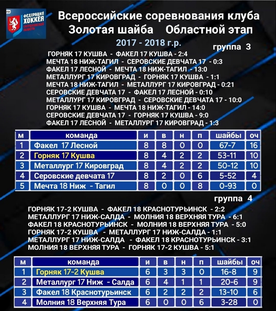 Конец января выдался насыщенным для кушвинских хоккеистов. На ледовой арене «Благодать» завершился второй круг областного турнира «Золотая шайба», где определились команды, продолжающие борьбу за победу. В группах 3 и 4 среди игроков 2017 года рождения развернулась нешуточная борьба за путевки во второй этап «Золотой шайбы». Команда «Факел» из Лесного продемонстрировала безупречную игру, одержав 8 побед в 8 матчах, и уверенно заняла первое место в группе 3. В группе 4 кушвинский «Горняк-17-2» проявил характер и, благодаря упорной борьбе и личным показателям, обошел сверстников из Нижней Салды, завоевав заветную путевку. Тренер «Горняков-17» Ахмадуллин Марат отметил: «В принципе доволен двумя составами «Горняка», играли достойно бились, молодцы ребята. Группа 3 была сильнее, конечно, 4-й по составу и тем более «Факел» с Лесного очень прилично смотрелся, не даром они первыми стали. Второй состав большие молодцы заняли первое место в 4-й группе, пусть и не без труда, сумели опередить Нижнюю Салду по личным встречам. Во втором этапе будут участвовать 7 победителей групп, восьмая путёвка достанется лучшей команде, занявшей второе место - это по коэффициенту надо считать. Надо посмотреть если шанс у «Горняка-17».