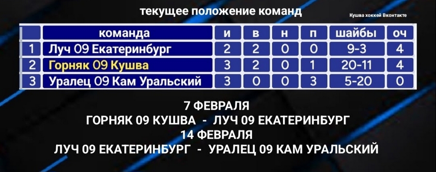 Сегодня в Каменск-Уральском кушвинские хоккеисты сделали важный шаг к чемпионству, обыграв местный «Уралец-09» в рамках областного финала. Эта победа дает кушвинским хоккеистам реальный шанс завоевать звание чемпиона области. Теперь «Горняку» предстоит ответственный матч 7 февраля на своем льду, где необходимо ликвидировать разницу в 4 шайбы во встрече со столичным «Лучом». Напомним, что матч в Екатеринбурге завершился победой «Луч» со счетом 6:3 (-3). Для досрочного чемпионства команде Александра Матазина необходимо добиться преимущества хотя бы в одну шайбу над екатеринбуржцами по сумме двух встреч, то есть победить с разницей в четыре шайбы. Если это удастся, то последняя встреча «Луча» и «Уральца» в Екатеринбурге станет формальностью.
