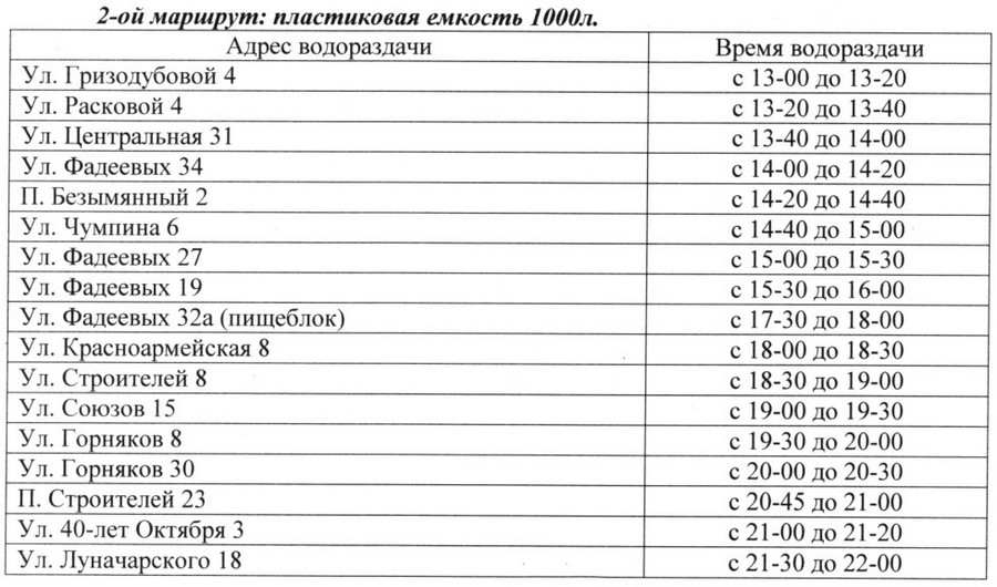 График подвоза холодной водыВ День весны и труда из-за аварии город остался без водоснабжения. На время аварии организован подвоз воды по микрорайонам.