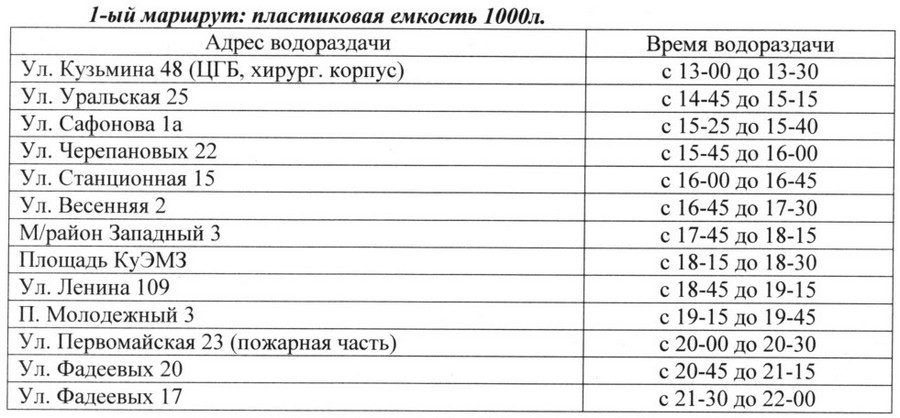 График подвоза холодной воды 1 мая 2023 года в г. Кушва.