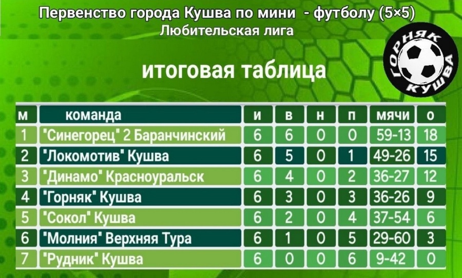 «Синегорец» сохранил лидерство в чемпионате после первого круга4 февраля в спорткомплексе «Горняк» состоялся очередной тур первенства Кушвинского городского округа по мини-футболу среди любительских команд.