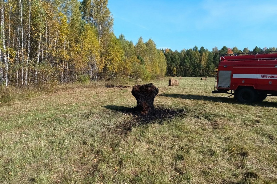 Сено, для одного это просто сухая трава, а для другого - корм для животных в зимнее время. Прибывшие огнеборцы ликвидировали пожар, однако девять тюков до их прибытия были уничтожены огнём. Предположительный виновник происшествия задержан и увезен сотрудниками полиции для дальнейшего разбирательства. Уважаемые граждане, будьте осторожны с огнём!