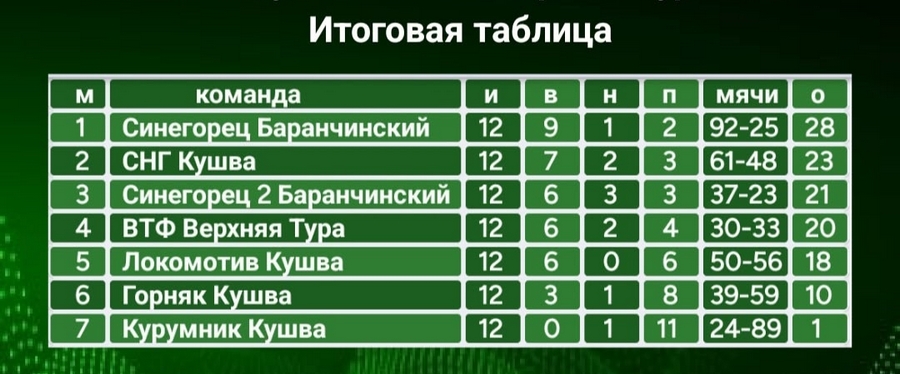 Финальный тур Кушвинского муниципального округа по футболу 7х7 среди любительских команд выдался невероятно напряженным и драматичным. 14 сентября на стадионе «Локомотив» ФК «Синегорец» принимал «Синегорец-2», а ФК «СНГ» сразился с «ВТФ». Для «Синегорца-2» победа в матче с основным составом была жизненно необходима для попадания в тройку лидеров. И им это удалось – уверенная игра завершилась со счетом 1:3 в пользу «Синегорца-2», что позволило им набрать 21 очко и временно занять вторую строчку турнирной таблицы. Теперь судьба второго места зависела от матча СНГ и ВТФ. Цена поражения была высока – четвертое место. В напряженной борьбе, богатой на голы, «СНГ» вырвал победу над «ВТФ» со счетом 6:5. Даже мастерство лучшего вратаря чемпионата Павла Егоркина не смогло уберечь его команду от поражения. Эта победа позволила «СНГ» обойти «Синегорец-2» по очкам и завоевать серебряные медали чемпионата. Лучшие игроки чемпионата:
