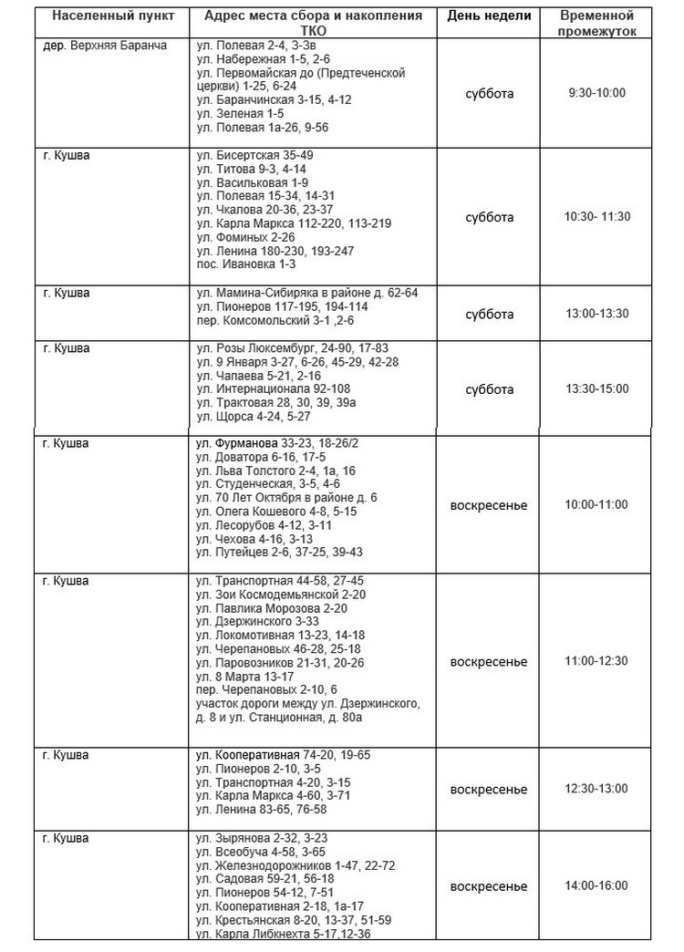 Новый график бесконтейнерного сбора ТКОГрафик бесконтейнерного сбора твердых коммунальных отходов на территории частного сектора г. Кушва по состоянию на 12 января 2026 года.