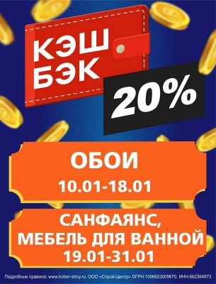 С 10 по 18 ЯНВАРЯ при покупке обоев вернем 20% бонусами на карту! А с 19 по 31 ЯНВАРЯ кэшбек 20% ждет вас за покупку санфаянса и мебели для ванной комнаты. Полный текст
