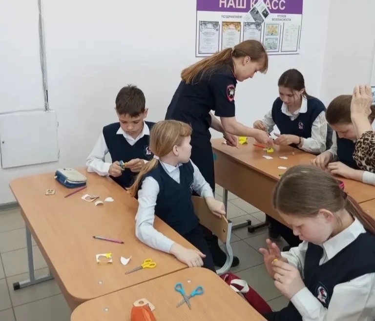 После экскурсии учащиеся приняли участие в мастер-классе по изготовлению световозвращающих элементов. Ребята вырезали яркие наклейки из специальной световозвращающей пленки, которые тут же прикрепили к рюкзакам и курткам.